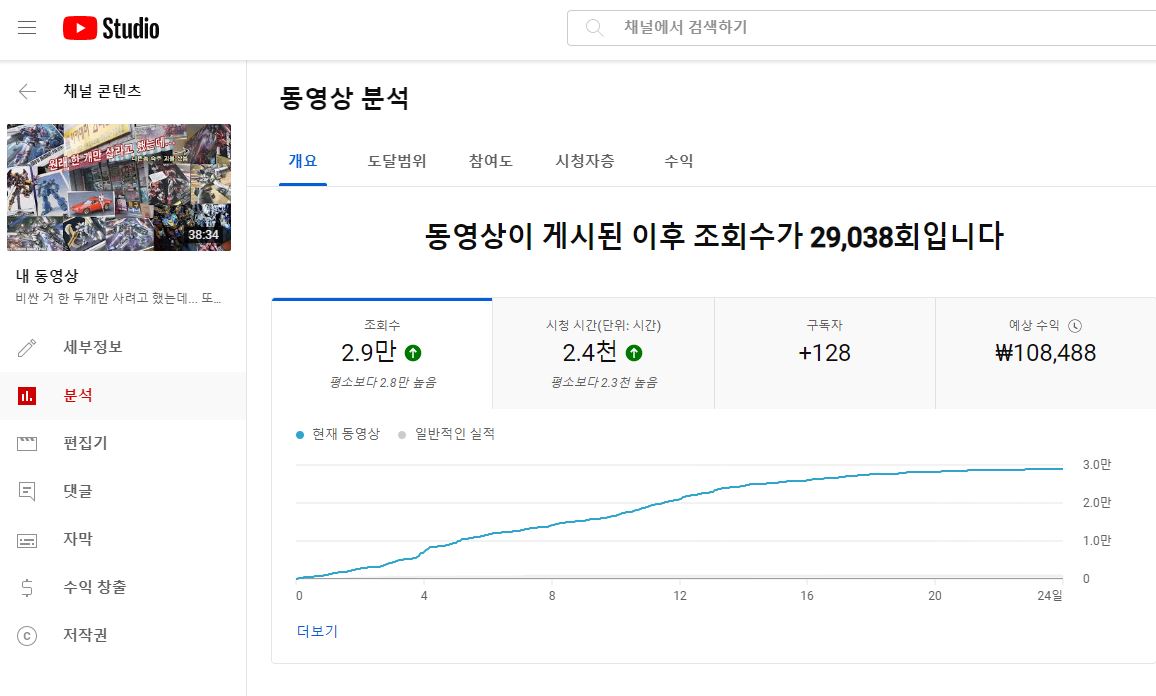 그러다~ 에어컨 영상이나 삼단봉 사용법 영상처럼 조회수 하나 폭팔하면 10~100만회 였다. 조회수 5만회 이상 가는 경우는 아주 드물기 때문에, 올리는 대부분 영상이 조회수 1천회에서 끝난다.