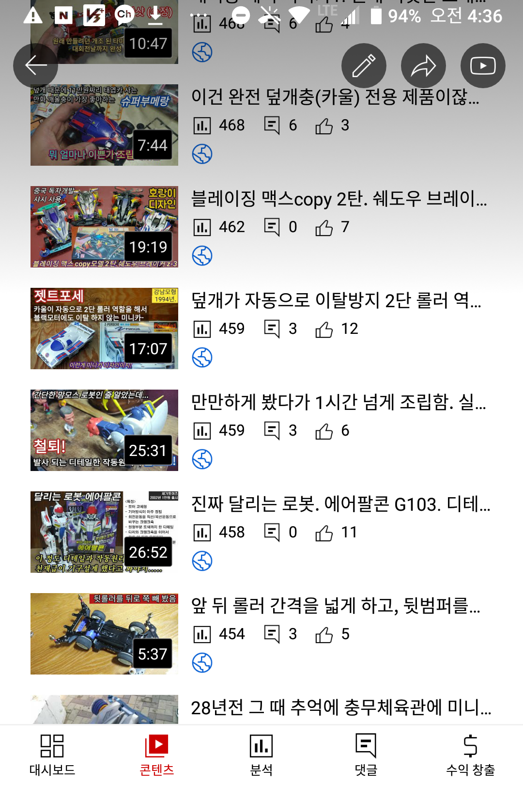 새로 만든 채널에서 '조립과정' 영상중에 조회수가 잘 나오는 (이 때는 몰랐지만) 고전 로봇 조립 영상도 360회이다.