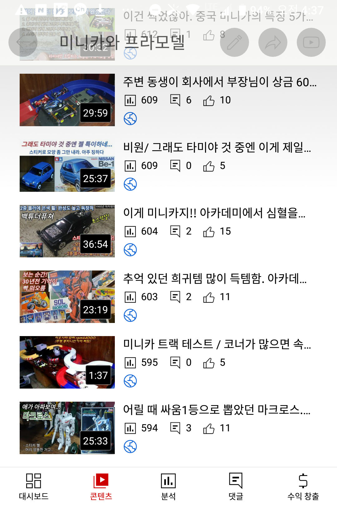채널을 분할하기 전에는 프라모델/ 미니카 조립 영상은 아무리 올려도 1천회 넘는 것이 10개중 1개도 안 되었다. 프라모델과 미니카는 시청자가 다르다. 같은 장난감이지만, 건담 좋아하는 사람은 미니카 관심 없고, rc(무선조종) 보는 사람은 건담 관심 없고, 피규어 좋아하는 사람은 거의 같은 것임에도 건담 같은 프라모델(드래곤볼 주인공 조립제품)도 관심 없다. 같은 음악이지만, 팝송 좋아하는 사람이라도 국악 관심 없는 것과 비슷하다.